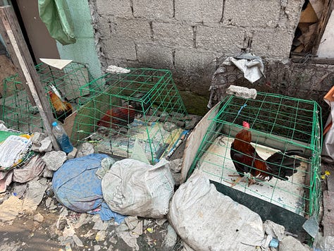 there are roosters kept in cages that are used for cock fighting;